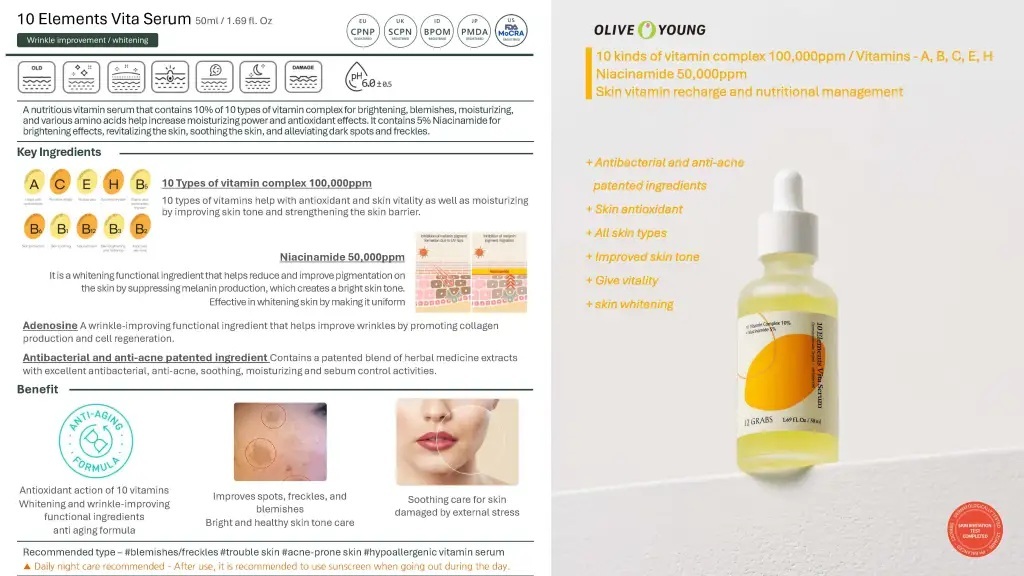 主要成分:10種維他命複合物(100,000ppm)(維他命 A、B、C、E、H)、煙酰胺(50,000ppm)、腺苷、MultiEx BSASM Plus 專利草本複合物