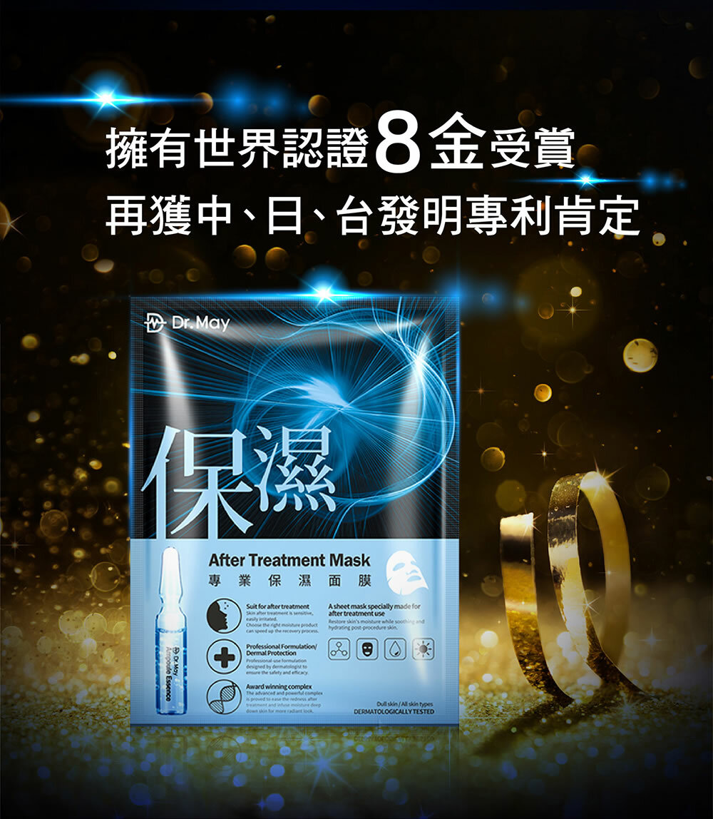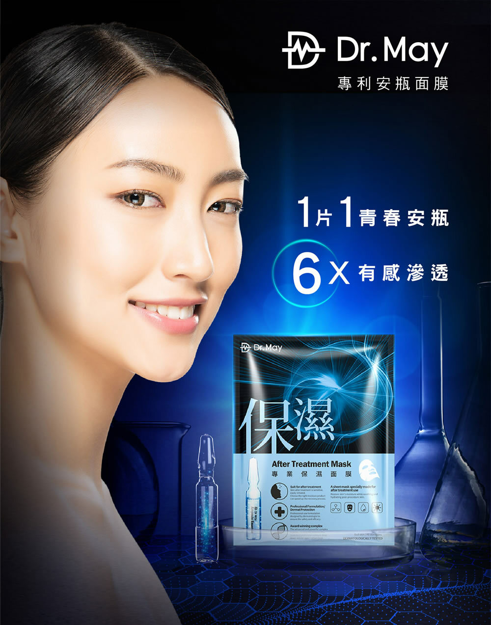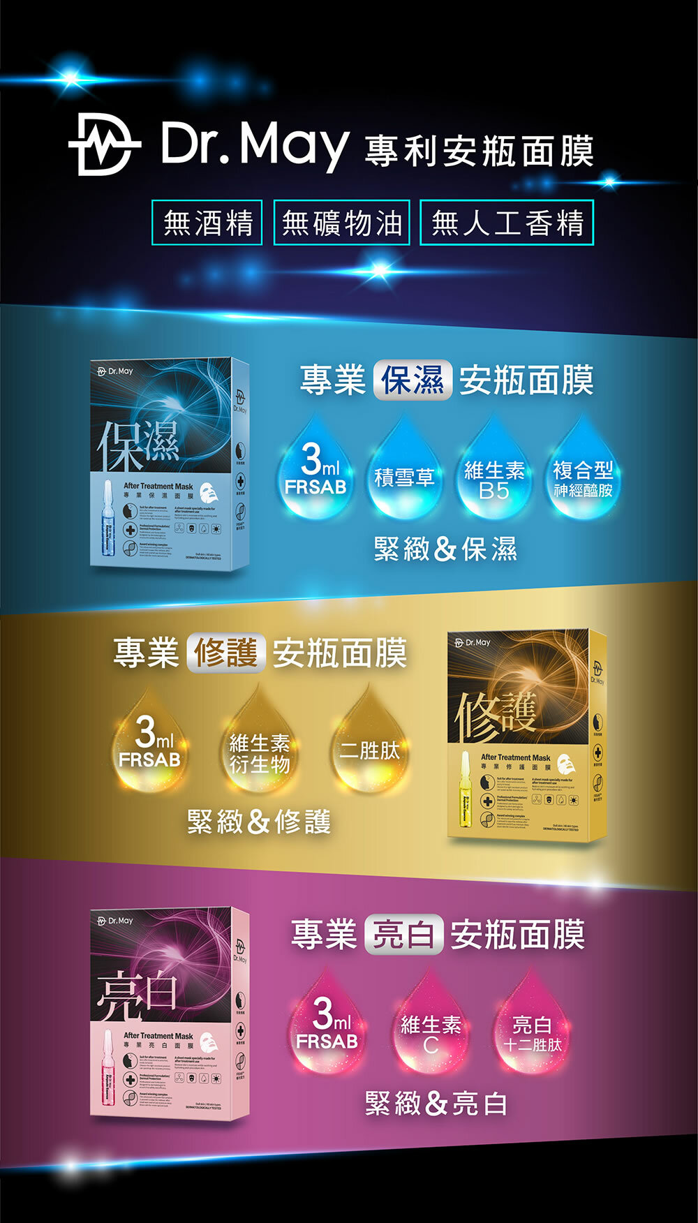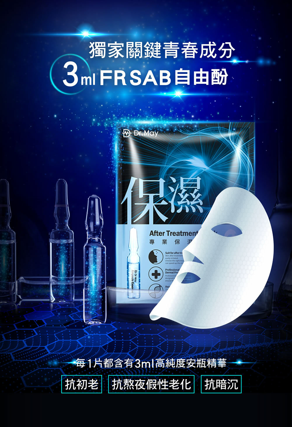 Dr.May美博士專業面膜,專利FRSAB複方精油添加,使用10分鐘幫助肌膚持續透亮水潤