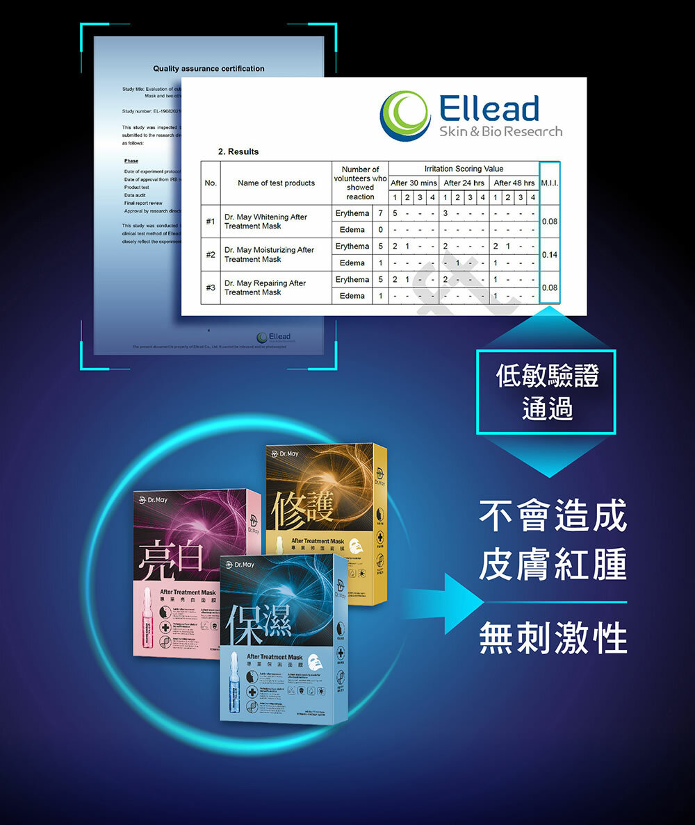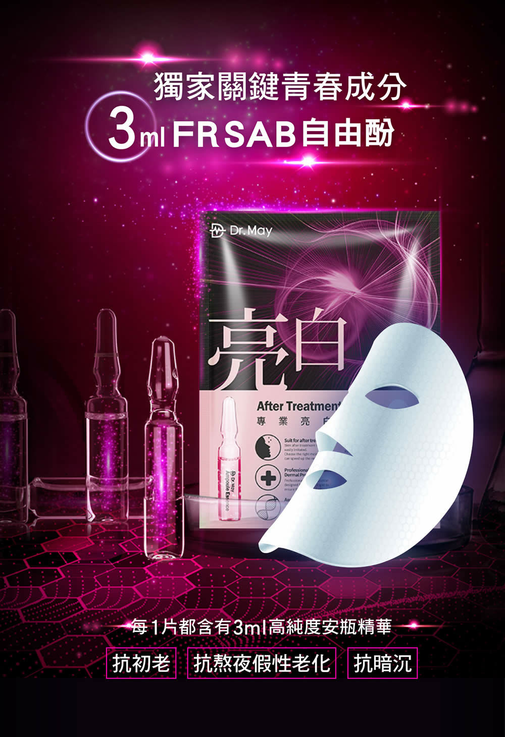 Dr.May美博士專業面膜,專利FRSAB複方精油添加,使用10分鐘幫助肌膚持續透亮水潤