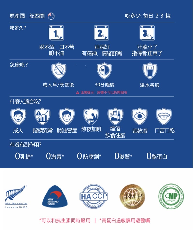 •每日劑量:飽肚服3粒,與抗生素間隔1小時。