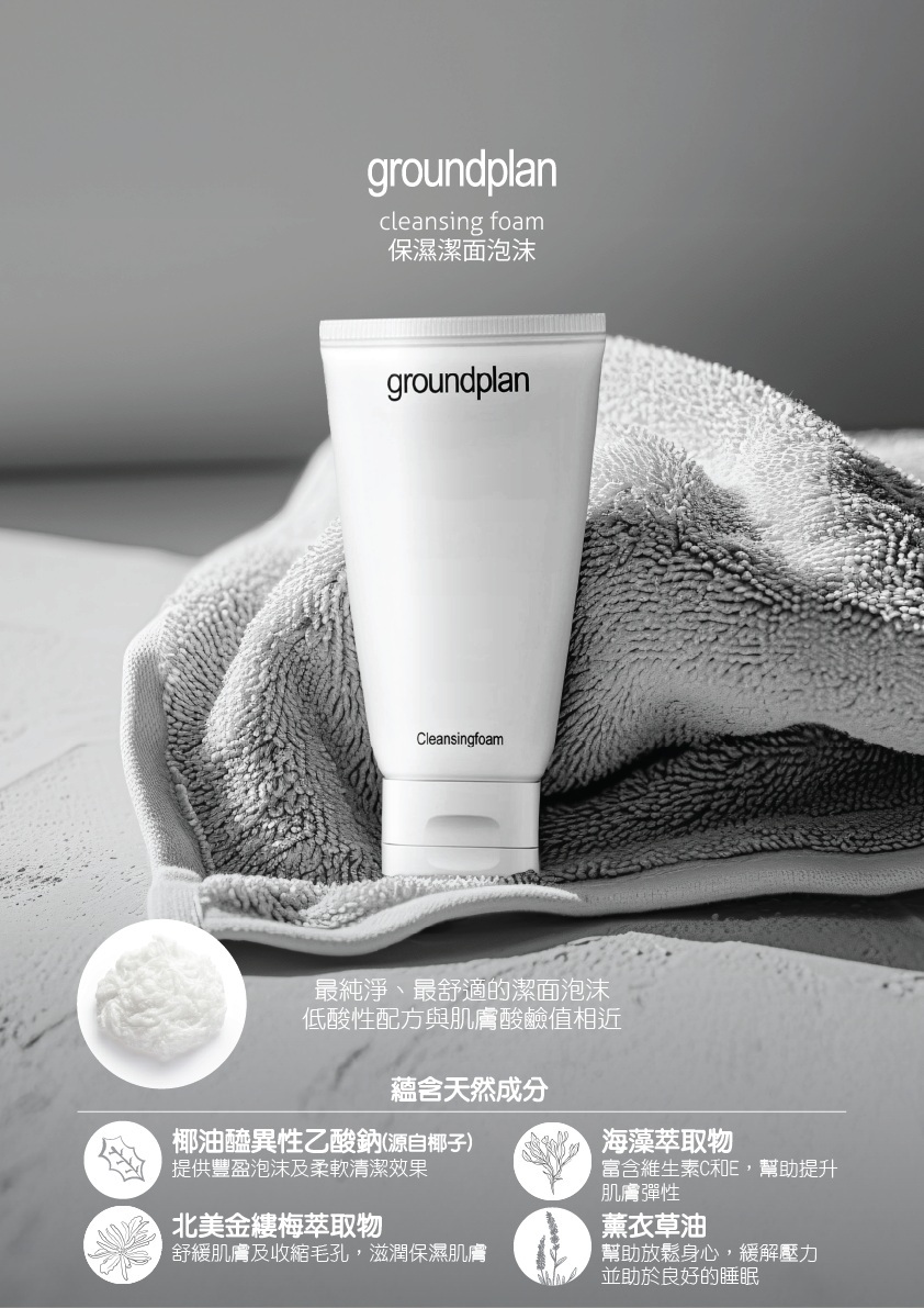 柔軟細緻的泡沫,輕柔包裹肌膚表層,清除每日堆積的污垢與皮脂,同時保留肌膚的水潤感。groundplan 保濕潔面泡沫採用低酸性配方與天然椰子來源表面活性劑,敏感肌也能安心潔膚,洗後不緊繃、不乾燥,留下清新舒緩的薰衣草香氣。