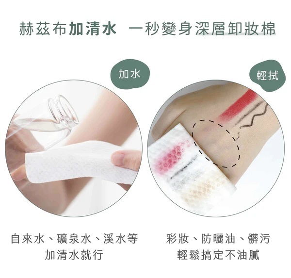 加水就能卸妝,不需要再將卸妝油或卸妝水倒在赫茲布上~