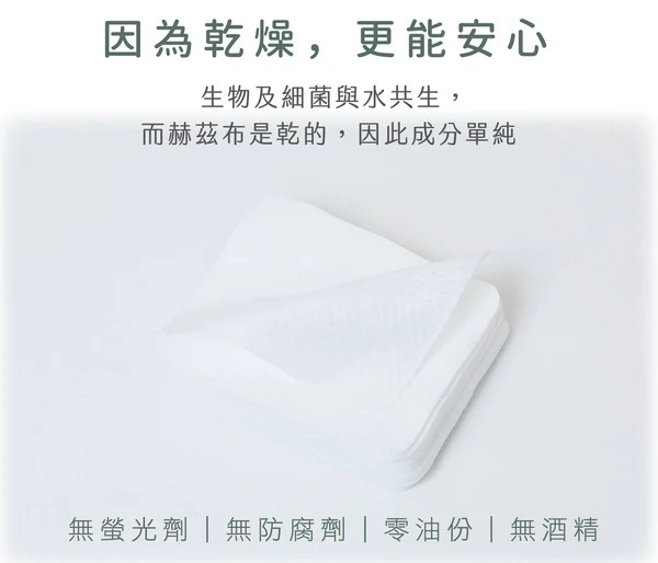 只要有水,就會產生細菌,而赫茲布是乾的,可以不加酒精、抗菌劑來防腐。要用時再加清水的特性,也讓赫茲布更好攜帶(輕)、更好保存(不會乾掉,也可跟其他濕的東西放一起)