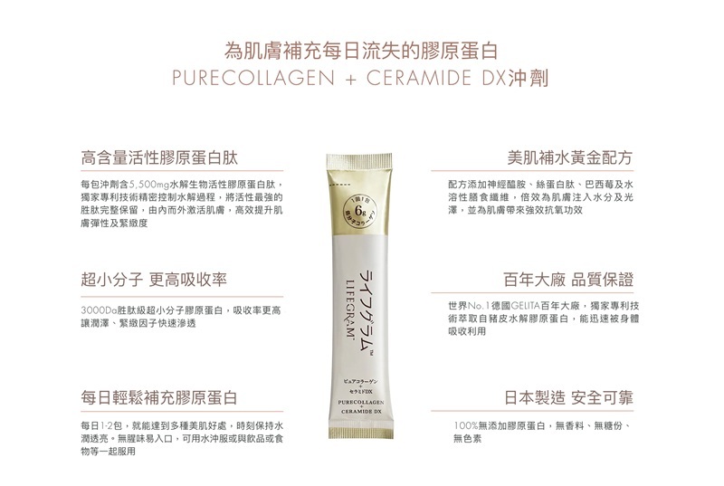 • 100%無添加膠原蛋白,無香料、無糖份、無色素