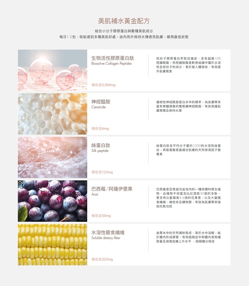 • 添加神經醯胺、絲蛋白肽、巴西莓及水溶性膳食纖維,倍效為肌膚注入水分與光澤