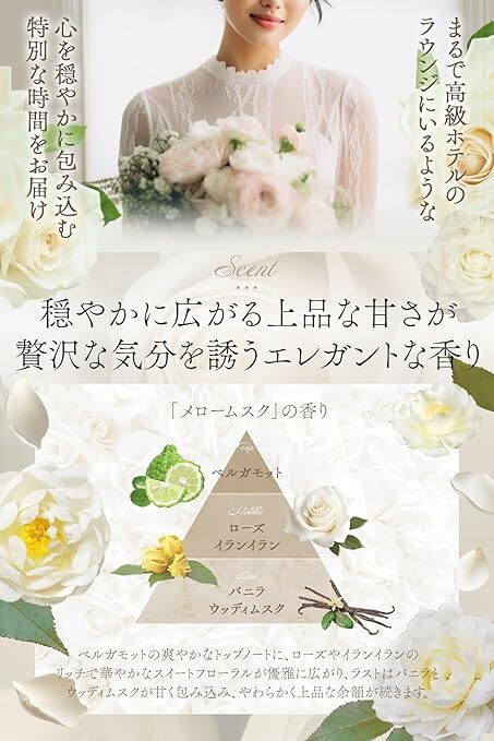 佛手柑清爽的前調,搭配玫瑰與依蘭依蘭的華麗甜美花香,優雅擴散包裹心靈。香草與深沉木質麝香留下餘韻,營造平靜且高雅的香氣氛圍。