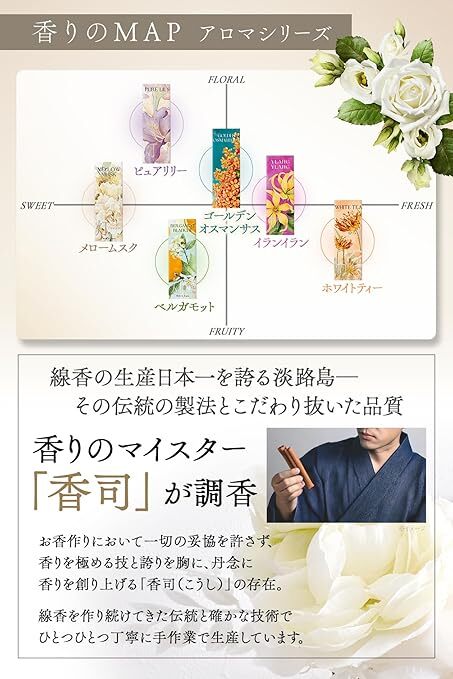 由日本少數香道大師「香司」精心挑選原料調配而成的奢華香氣。採用香氣產地淡路島的傳統製法,逐支手工精製而成。