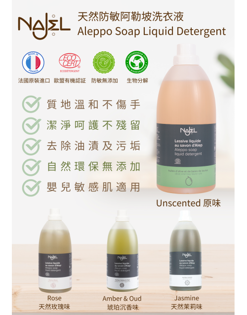 NAJEL 備有一系列的天然洗衣液 — 高度抗敏,特別適合皮膚敏感、濕疹皮膚的用家使用,亦可用於清洗嬰兒貼身衣物。