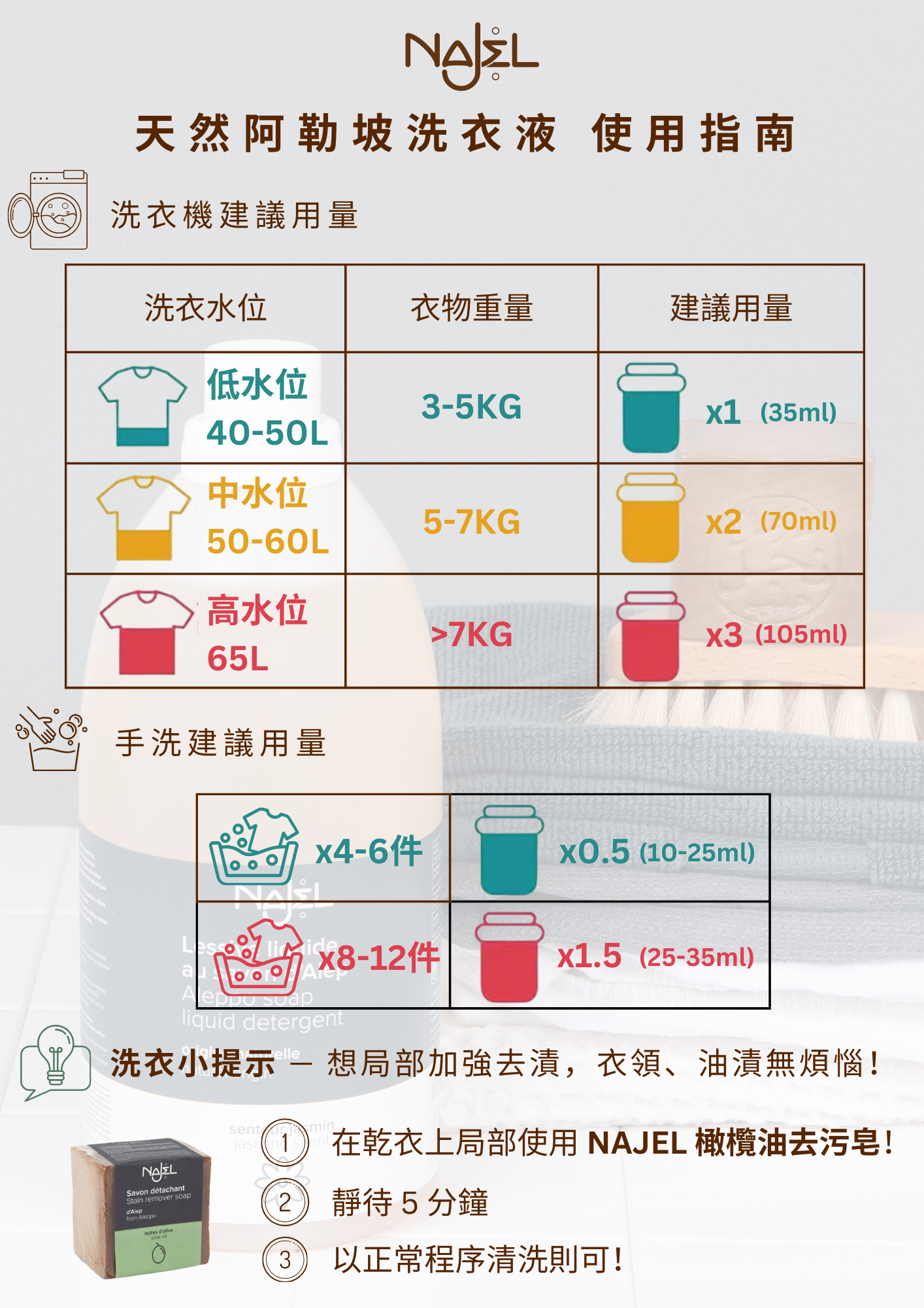 TIPS!對於特別頑固的污漬,可先用 NAJEL 去污皂擦拭污漬,其後按照常規程序放入洗衣機中則可。