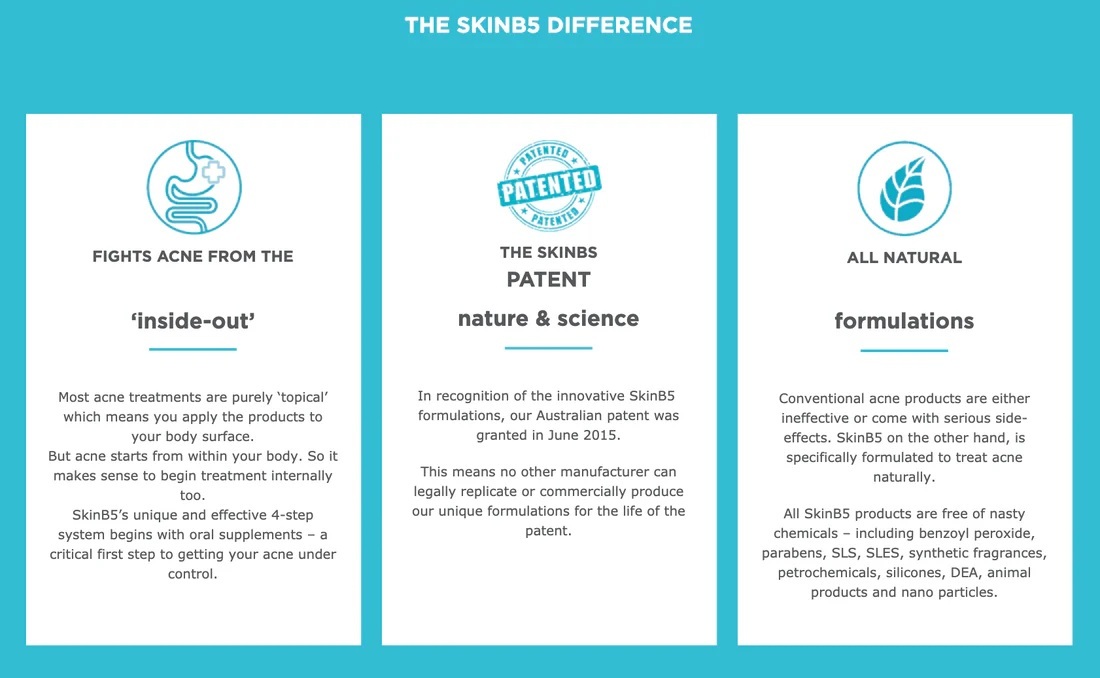 Discover for yourself the combined healing powers of Vitamin B5, Vitamin B3, Folic, Zinc, Copper, Silica and Vitamin A etc to actively promote a clear complexion. SkinB5’s revolutionary 360° approach assists with sebum control and cell renewal, builds immune defense, promotes internal harmony and alleviates stress.