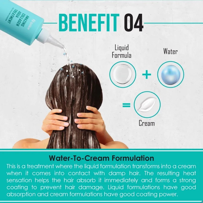 高度吸收的液體配方在與水混合後轉變為霜狀配方,為頭髮形成一層保護膜。