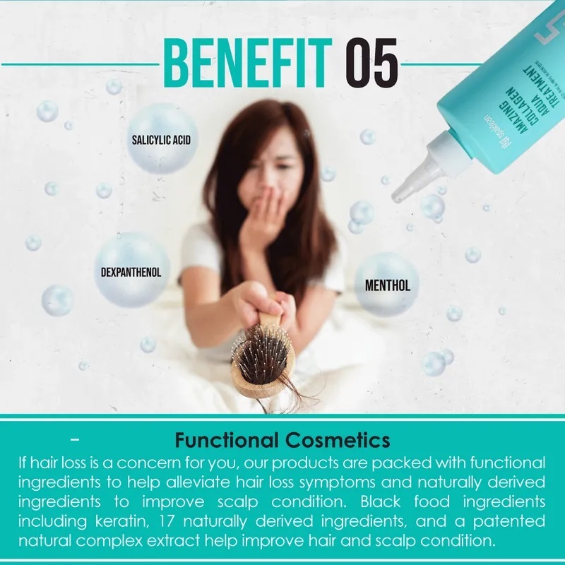 功能性美容品: 具有功能性成分以緩解脫髮症狀,並含有天然成分以改善頭皮健康。包括黑色食材成分、角蛋白、17種天然成分和一種專利天然複合提取物,有助於改善頭髮和頭皮狀況。