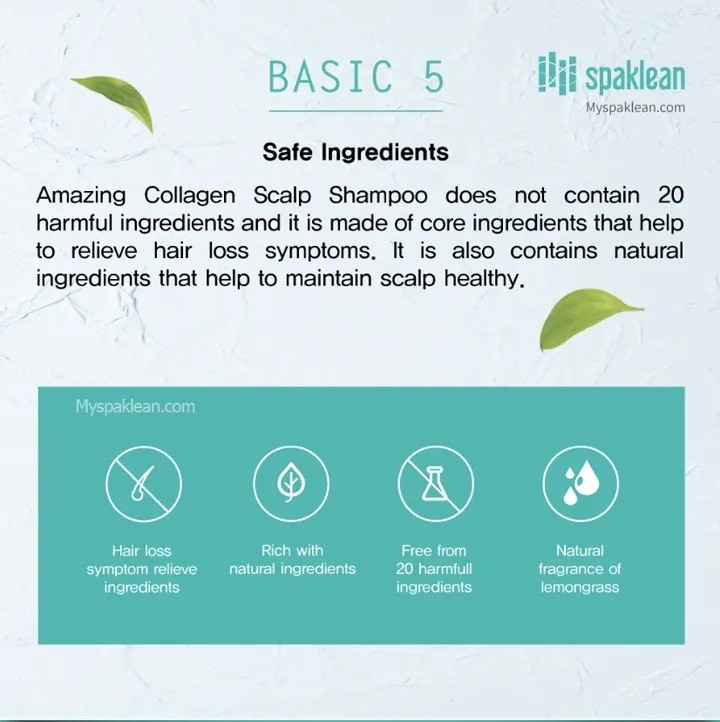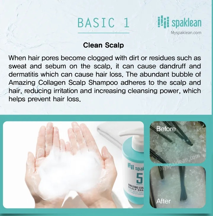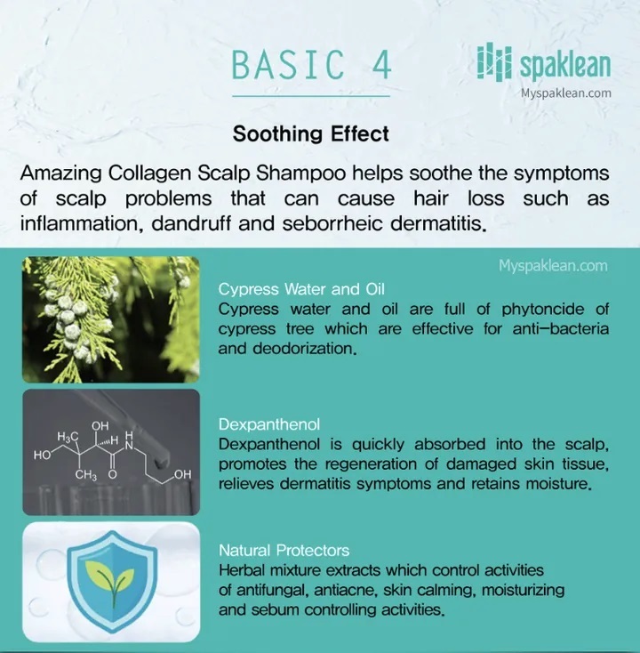 - 膠原蛋白頭皮洗髮水有助於緩解可能導致脫髮的頭皮問題症狀,例如炎症、頭皮屑和脂溢性皮炎。
