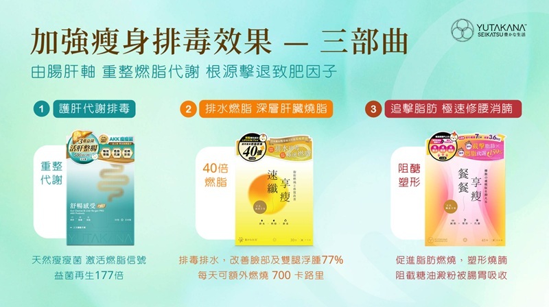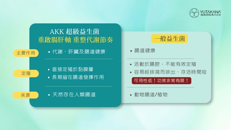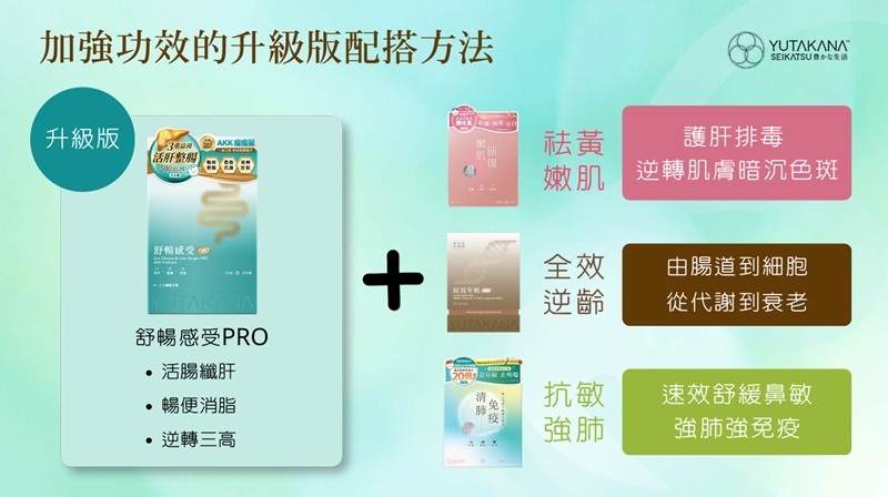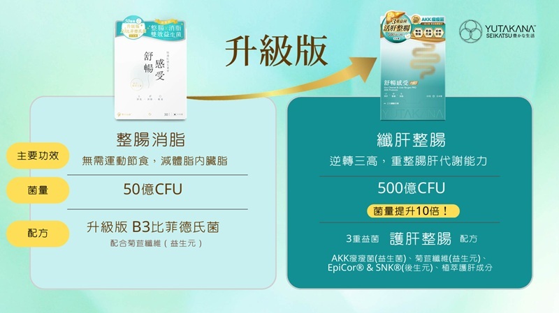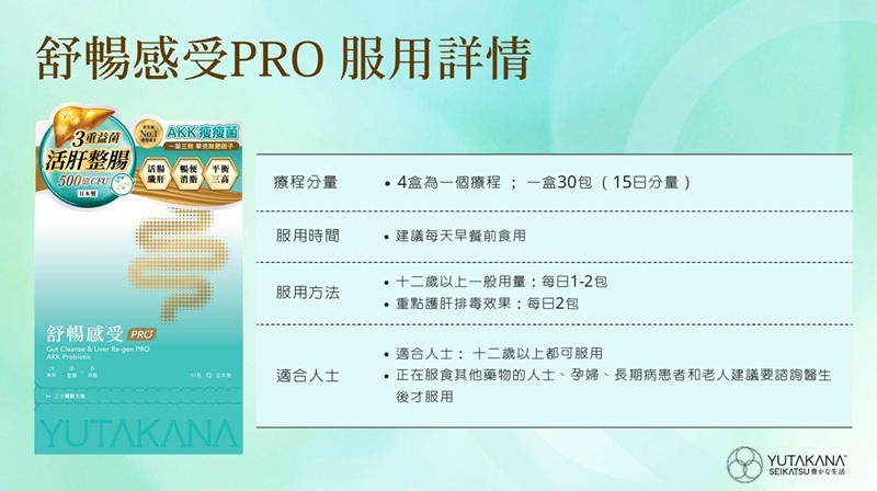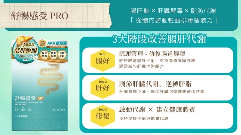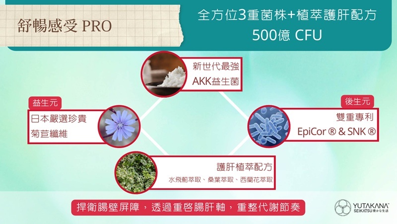 YUTAKANA豐盛生活舒暢感受PRO AKK瘦瘦菌,作為「舒暢感受B3益生菌」的升級版本,創新3重益菌護肝配方。產品採用新世代最強益生菌 - AKK菌,配合天然益生元 - 菊苣纖維及雙重專利後生元 - EpiCor® & SNK®。全方位捍衛腸壁屏障,修復身體第一免疫防線「腸黏膜」,防止腸內毒素或細菌經腸肝軸流走至全身或其他器官,繼而造成慢性炎症等危機。