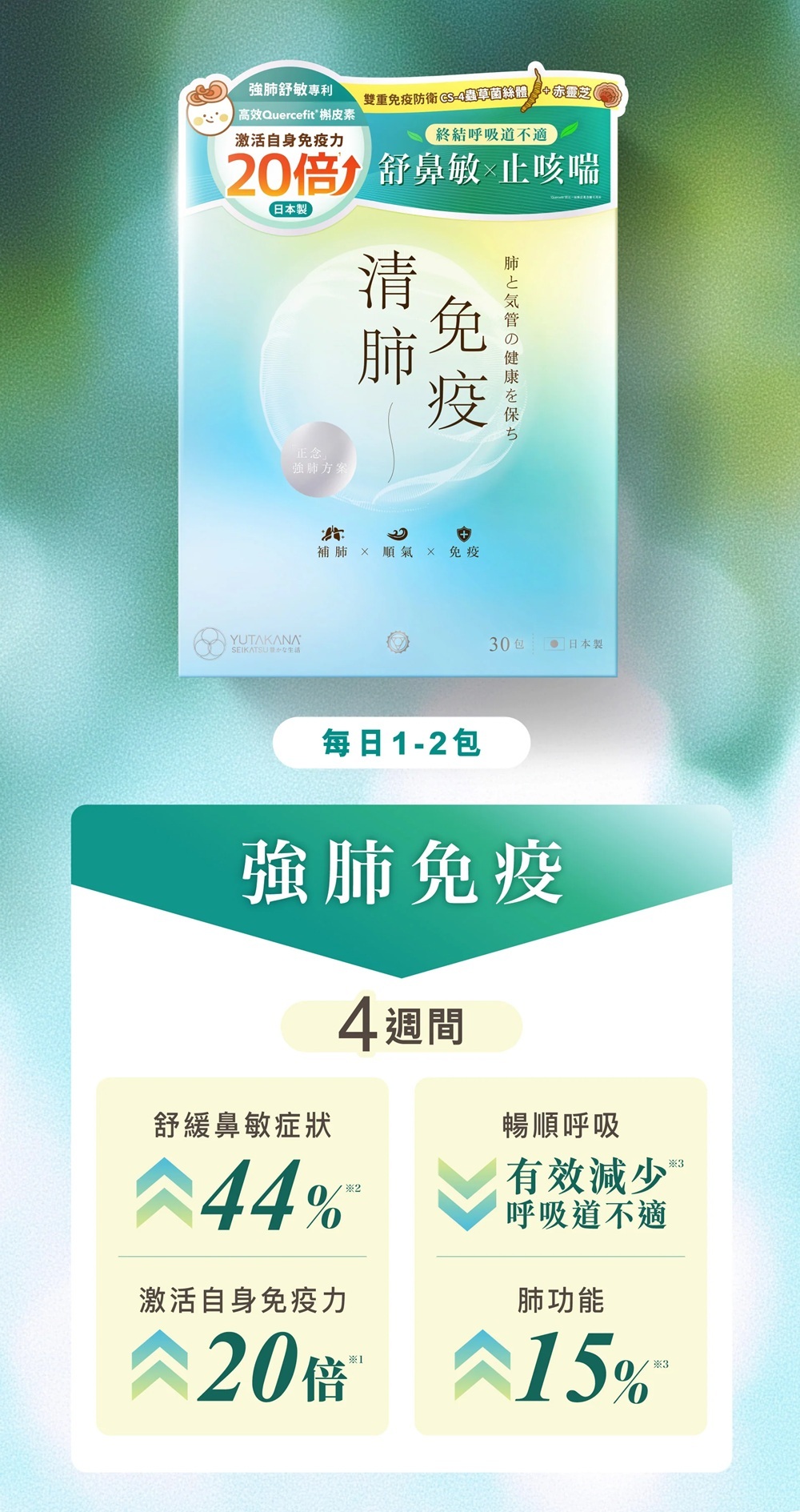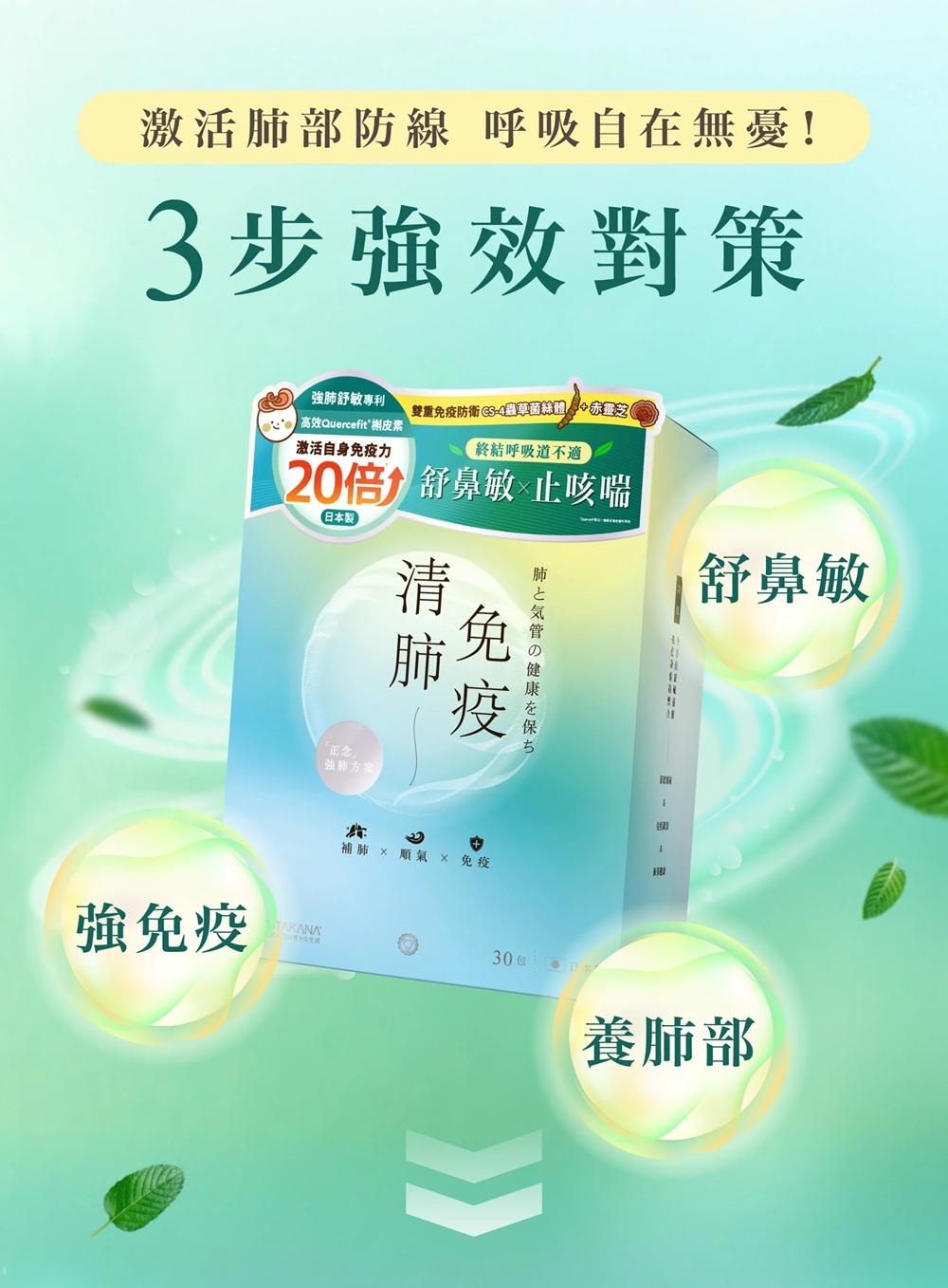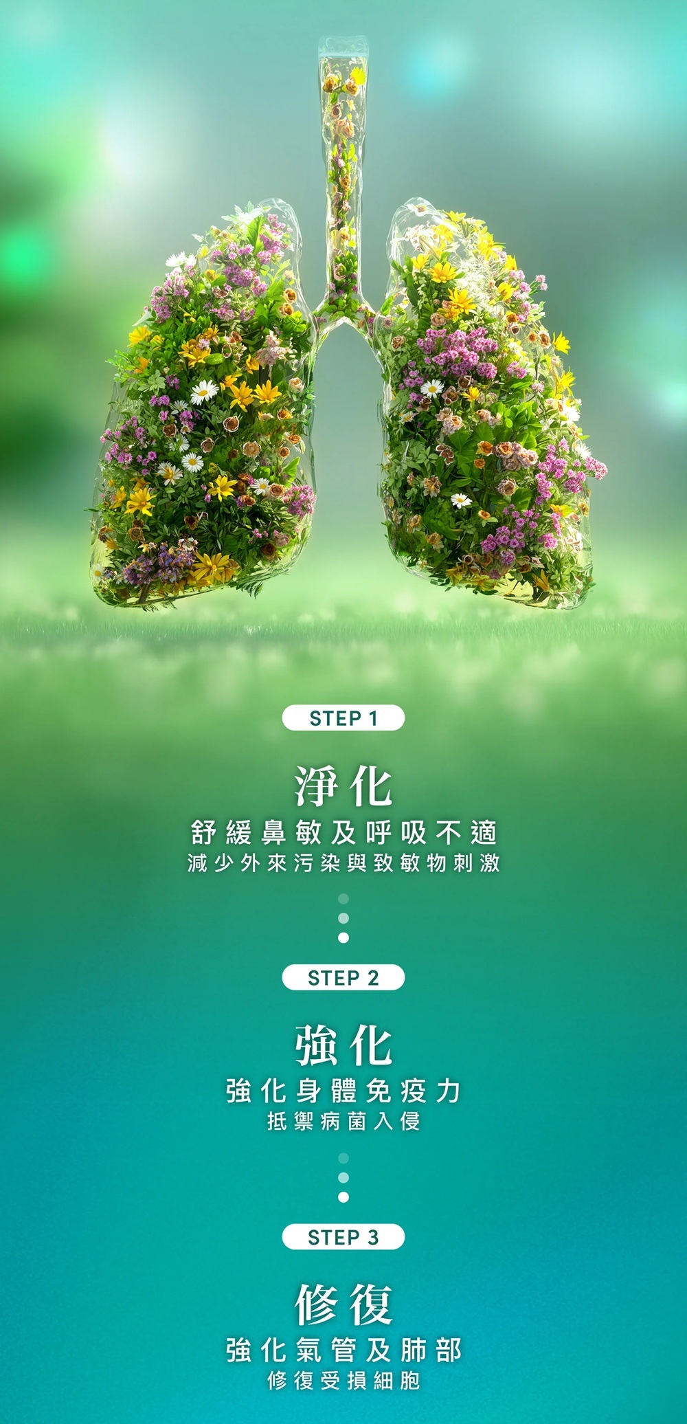 清肺免疫最強舒敏護肺方案,3步全效擊退鼻敏、 激活自身免疫力20倍 ※1、 4週改善呼吸道不適及肺部健康 ※3!